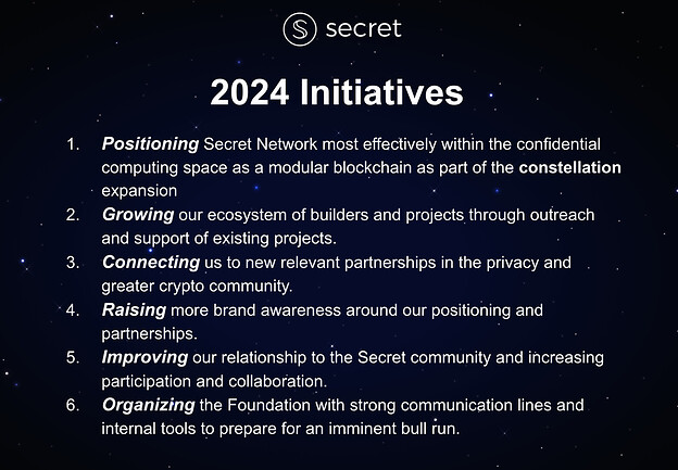 Regarding conversions, we have several we’re tracking against, including devs signing up for hackathons (432), devs going on to build projects on Secret (33), and partnerships closed. Our events in Q4 saw a higher conversion rate, due to the things we learned in Q3. Our 2024 events are already performing better than the 2023 events, and it’s still early.