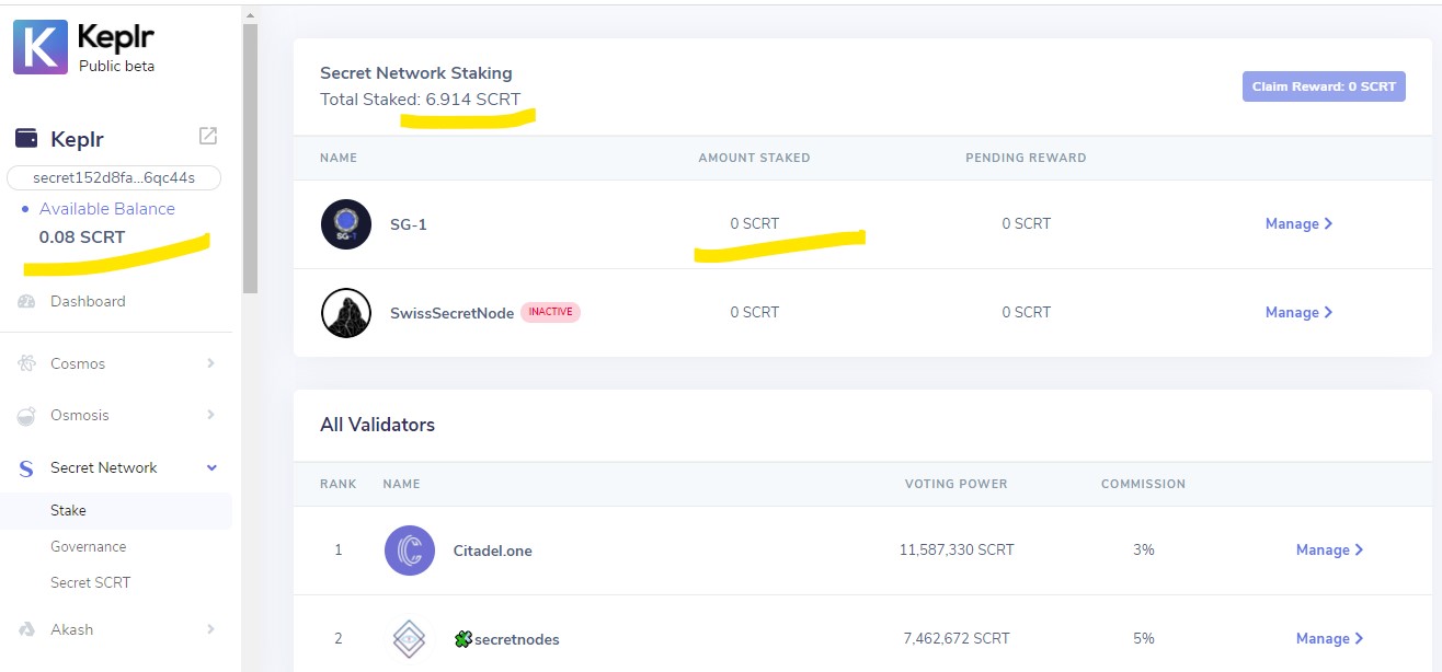Hello community, finally getting back to this one: I still have some minor SCRT funds “blocked” on my KEPLR wallet (moved most of it onto hardwallet). After undelegating it didn´t appear in my balance. See the print screens. Has anyone experienced the same? (I know, it is more of a KEPLR support thing - I have contacted them too)
